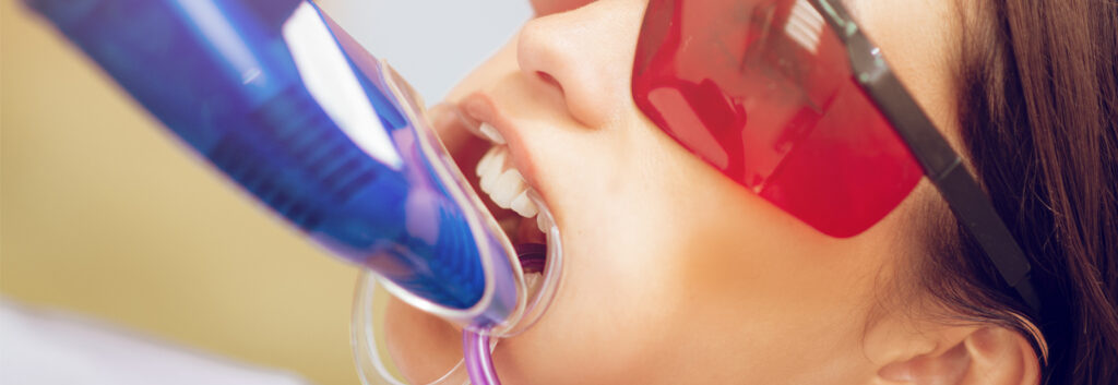 施術中は、安全のため保護メガネを装着し、LEDライトを歯に照射します。